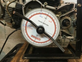 A 1mm d’ouverture de soupape vous obtenez une valeur en degré sur votre disque gradué, ici 25° avant point mort haut comme d’origine avec ces arbres, mais nous voulons 34°.