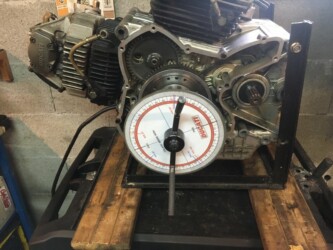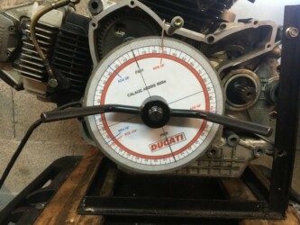 Tourner le vilebrequin jusqu’à arriver en butée sur le bloque piston et mettre le disque gradué à zéro PMH.